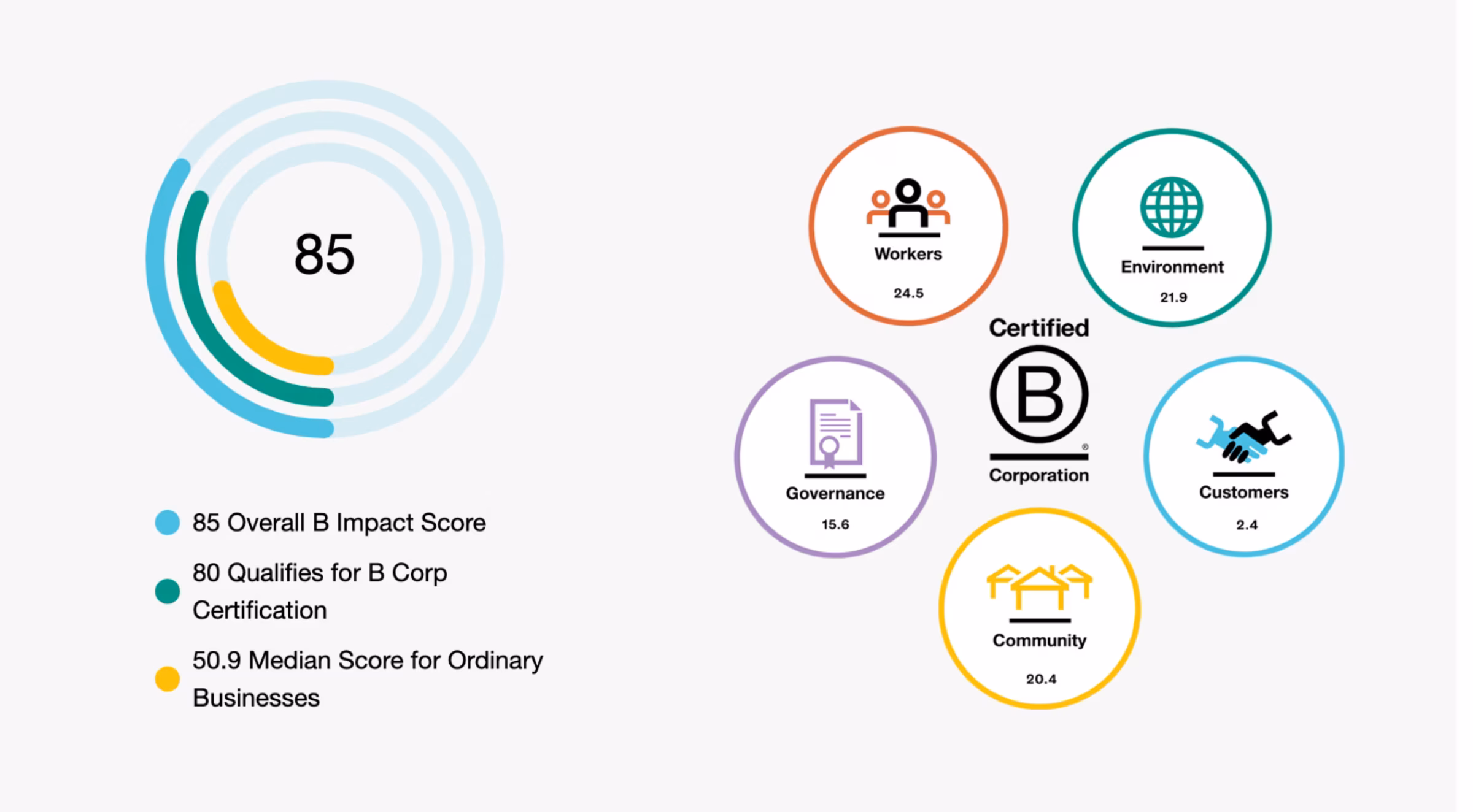 The B Corp movement (the B standing for “Benefit for all”) is helping transform the global economy to benefit all people, communities and the planet. To become B Corp certified, businesses must achieve a verified score of 80+ points in the B Impact Assessment, a tool that measures operations across five impact areas: Governance, Workers, Community, Environment and Customers.