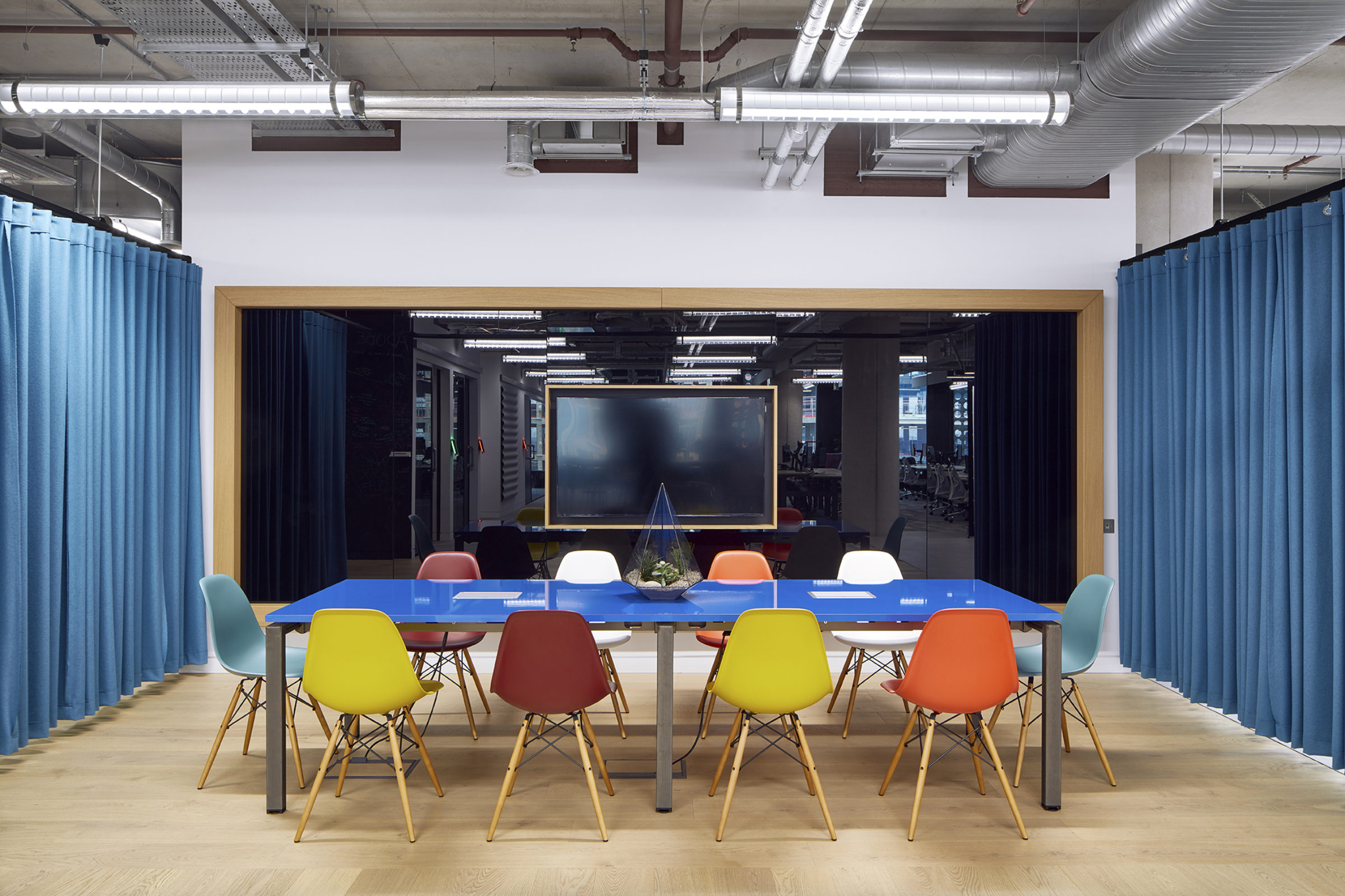 The design celebrates the industrial character of the White Collar Factory, expressed through exposed soffits, mesh ceilings, concrete surfaces and metal factory doors. Warm timber flooring balances the raw architectural shell, while a saturated colour palette, inspired by Adobe’s Creative Suite tools, introduces vibrancy throughout. A bold red perforated metal stair cuts through two floors, acting as a striking focal point and a physical connector between teams.