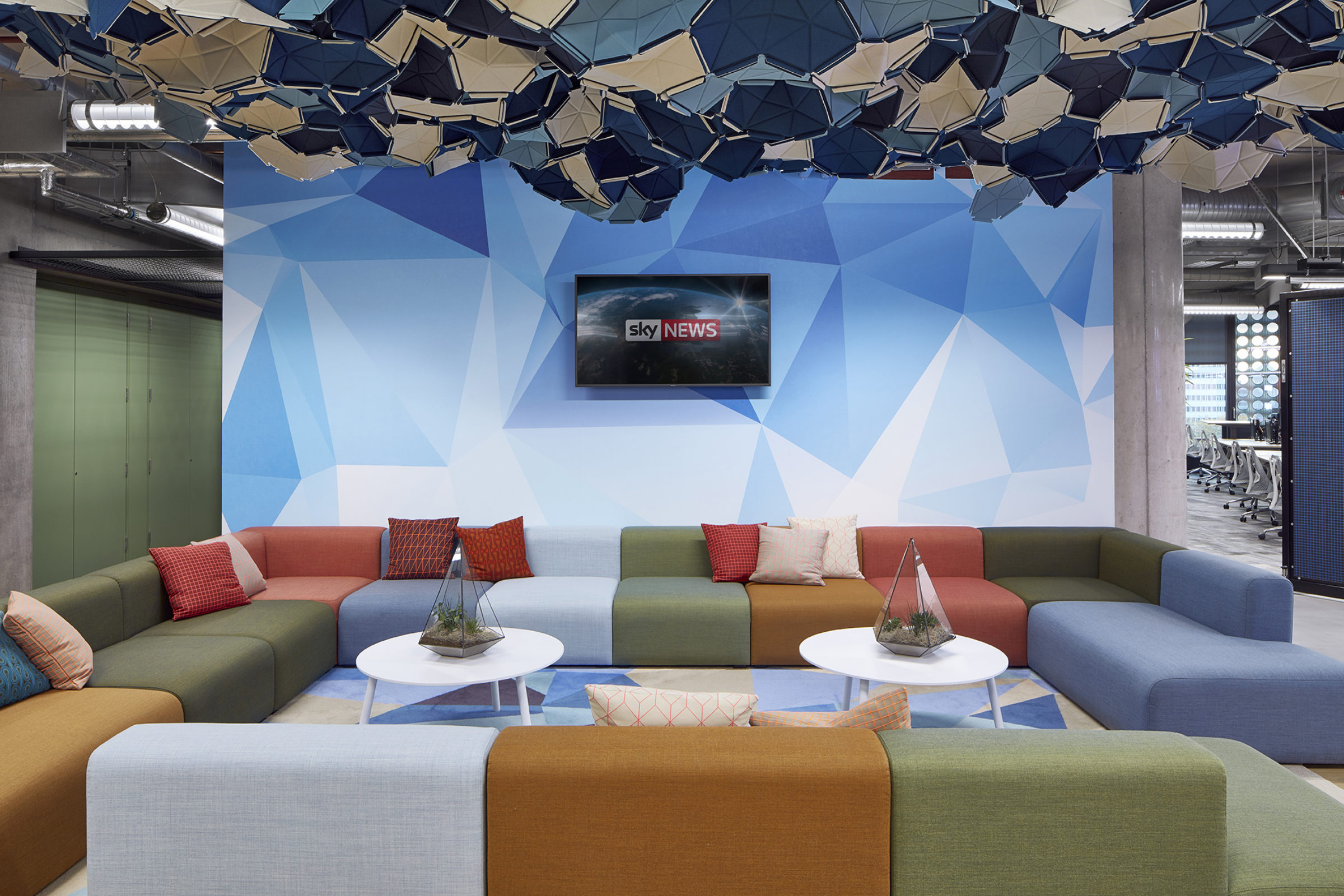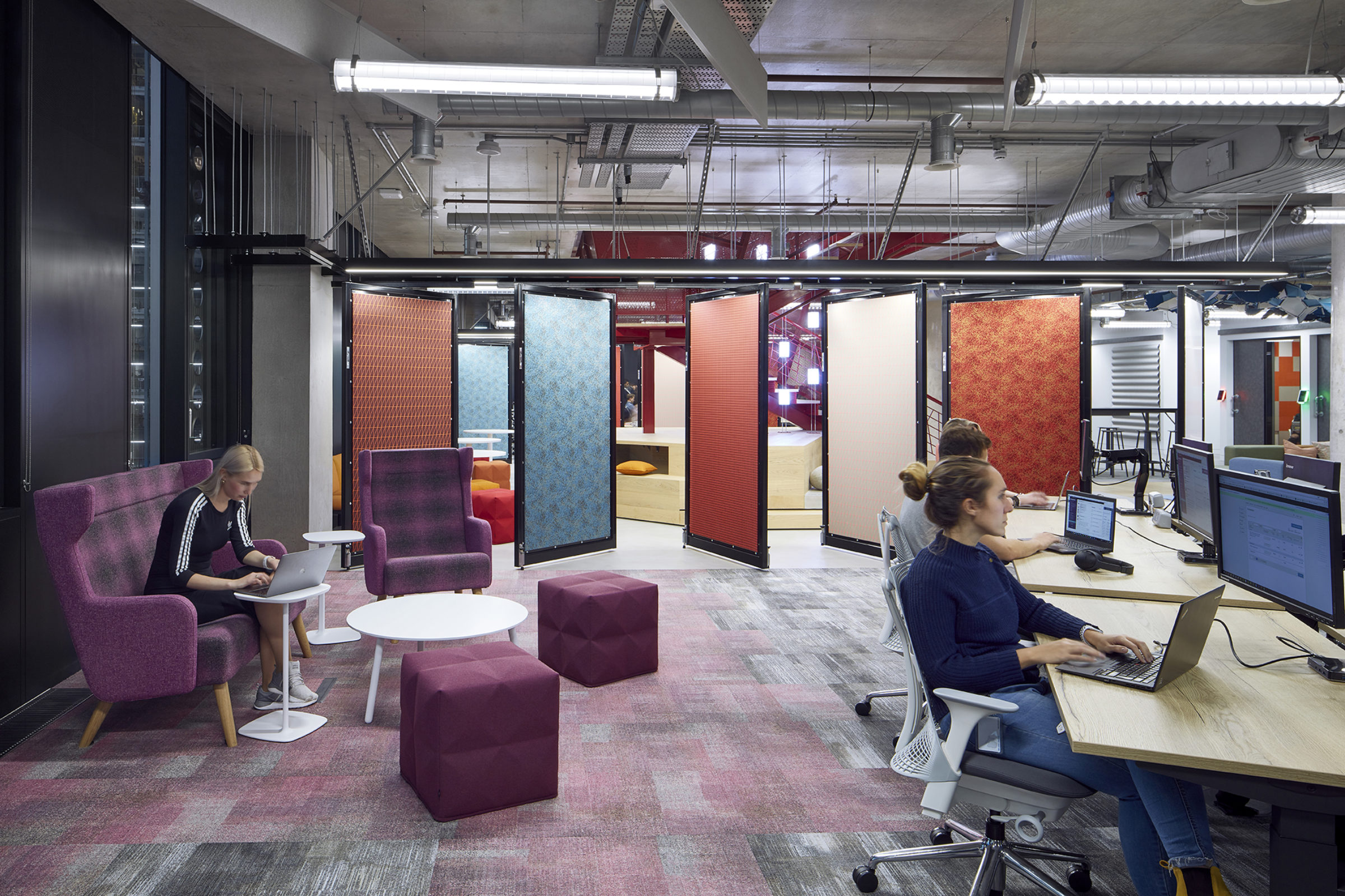 Furniture choices amplify the energy and playfulness of the interiors. Working closely with Gensler, we curated settings that bring comfort, flexibility and personality to the open-plan environment. Bright modular sofas and soft lounge chairs in expressive colours create relaxed collaboration zones, while upholstered benches help anchor key social spaces. Bespoke hand-crafted rugs introduce warmth and tactility, defining neighbourhoods within the open plan. Lockers integrated into tailored joinery runs support agile working and maintain a clean, ordered aesthetic.