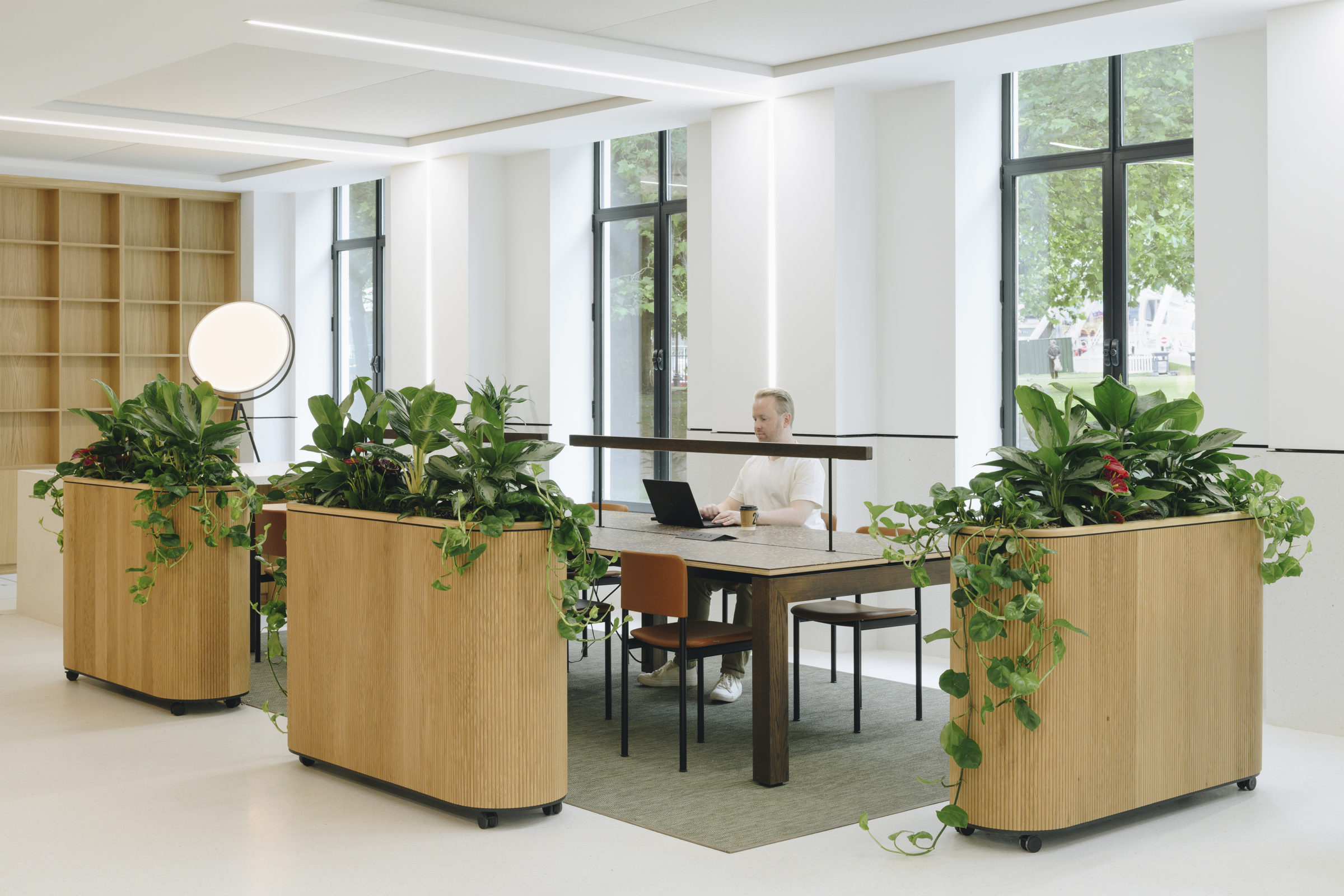 Every material chosen for Five St Philips served a dual purpose: meeting rigorous sustainability standards and creating a beautiful, comfortable environment for its users. One key example is the extended table featuring a Foresso top, an innovative material made locally in Birmingham.