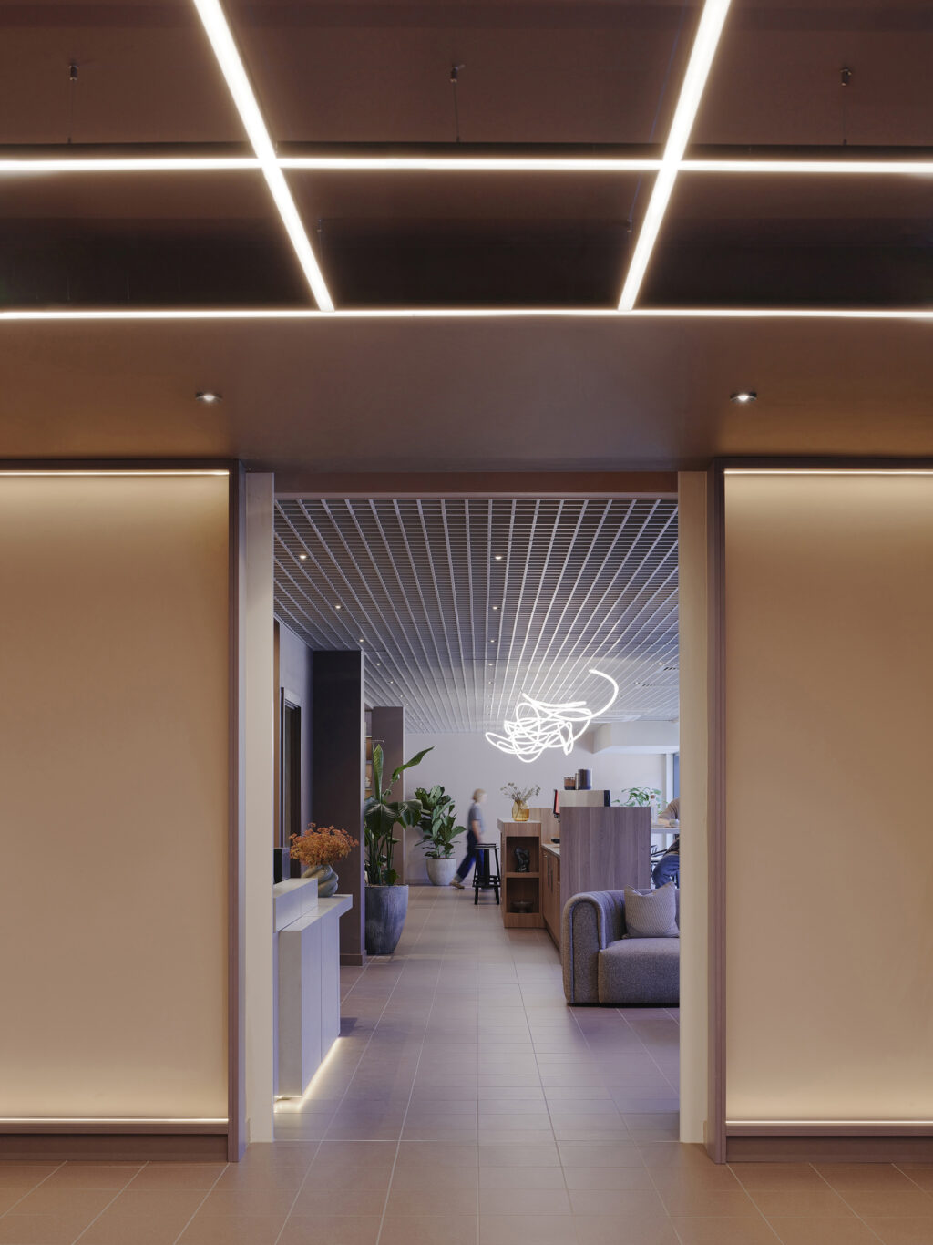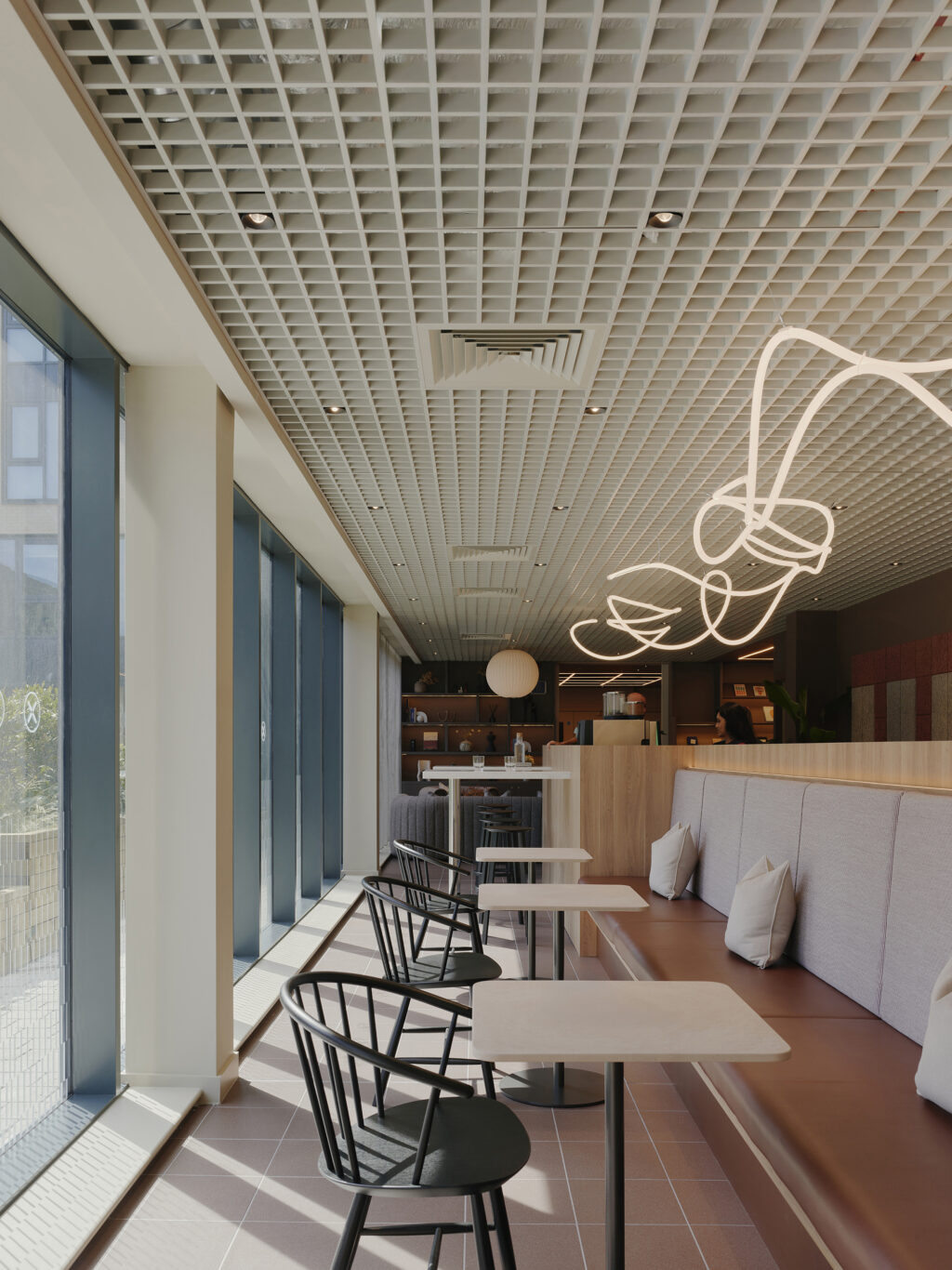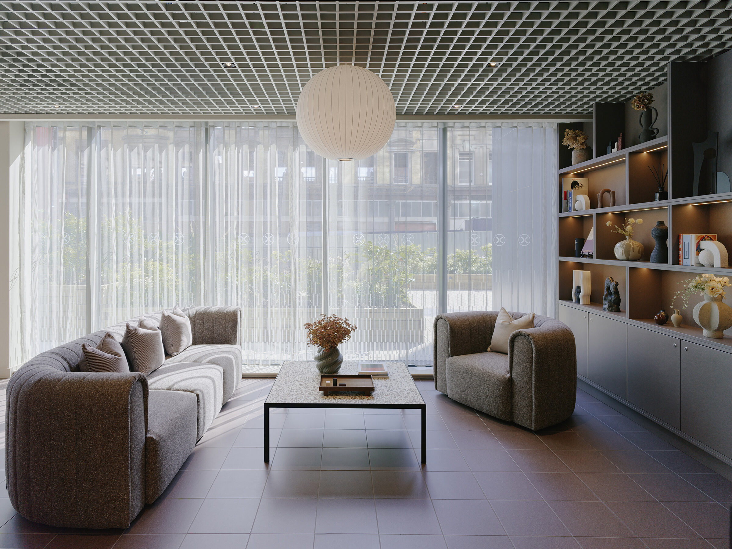 The amenity space has been carefully planned to support a wide range of daily activities. Multiple settings are arranged around a central coffee bar, creating spaces for working, relaxing, waiting and socialising. Key zones include an entrance arrival and concierge area, a quiet work pod, a coffee bar for residents and the management team, and a mix of flexible soft-seating and lounge areas.