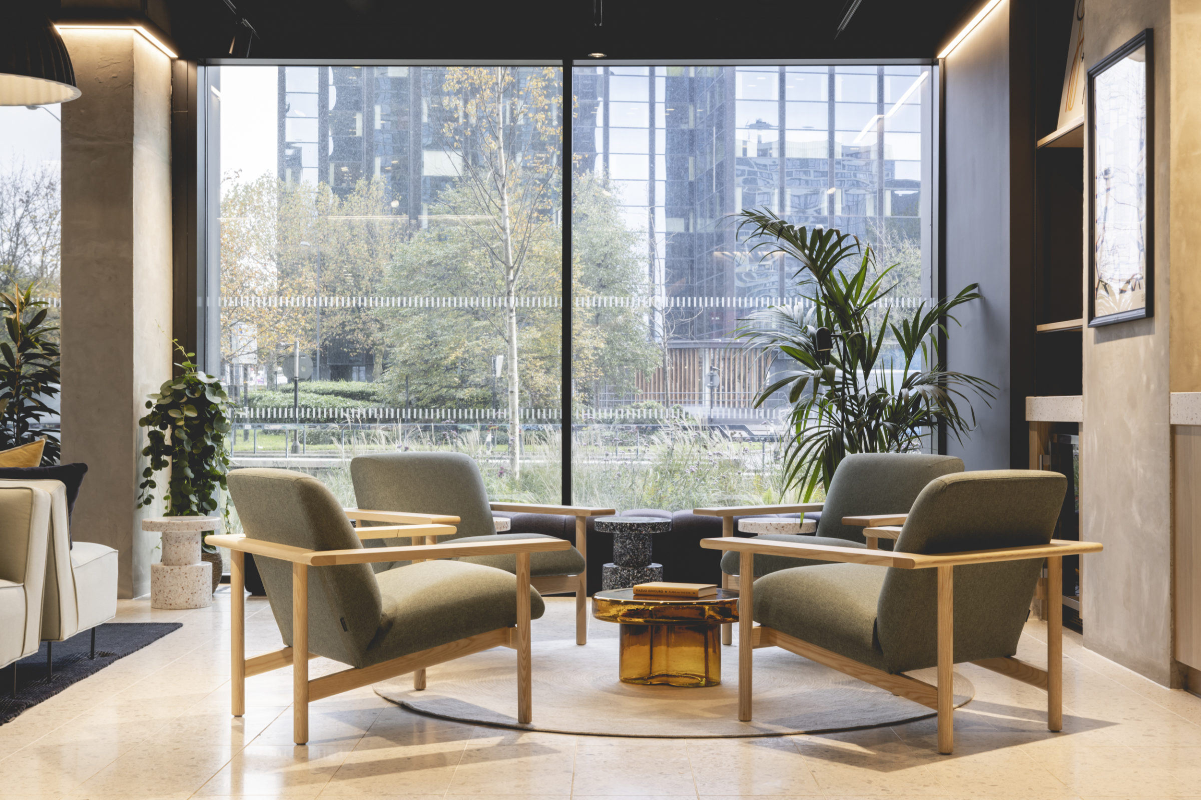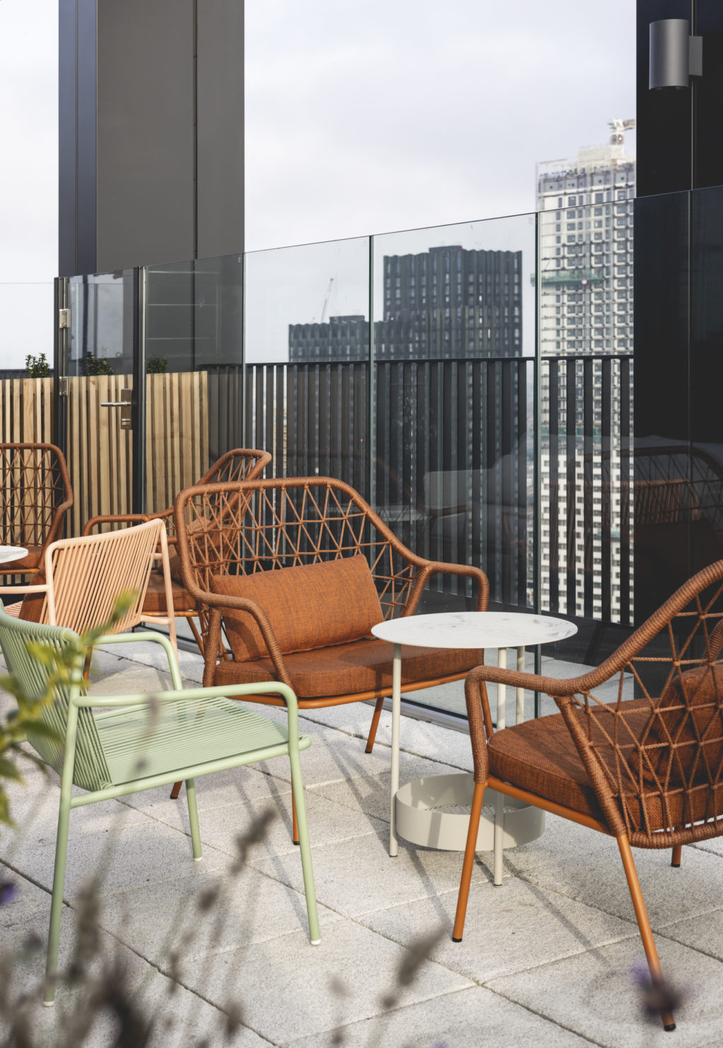 Alongside a mix of one, two and three-bedroom boutique apartments, The Fold’s amenities, designed by Morrow + Lorraine, offer generous communal spaces for work and relaxation. These include a co-working lounge, meeting rooms, shared social areas, a kitchenette, a library and a rooftop terrace with views across London. Our role spanned every stage of the furniture process, from specification development and space planning to procurement, delivery and installation.