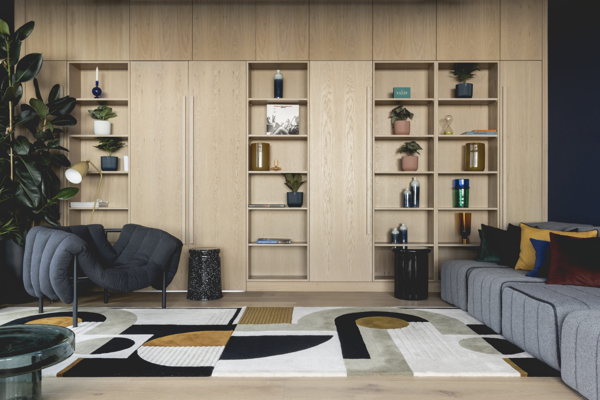 Creating a vibrant, creative and homely atmosphere was central to the design vision. Working closely with Morrow + Lorraine, we selected materials and finishes that respond to the building’s interior palette, creating a scheme that feels eclectic yet cohesive. Bold geometric rugs and comfortable seating with pops of colour bring energy to the communal areas, contrasting with warm timber tones used throughout the joinery and flooring.