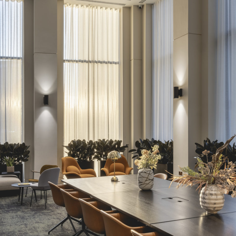 Throughout the design process, we worked closely with MPEC and the building’s interior designers JOLIE to embed the sustainable values of 4 Angel Square into every design decision. In upholstering the furniture, for instance, we prioritised fabrics that are naturally flame resistant, such as Kvadrat’s Hallingdal and Encircle textiles, thereby avoiding additional treatments that come at an environmental cost. What’s more, these high-quality fabrics set a welcoming ambience for the building’s reception, waiting area, and co-working space, showing that environmental excellence need not mean aesthetic compromise.