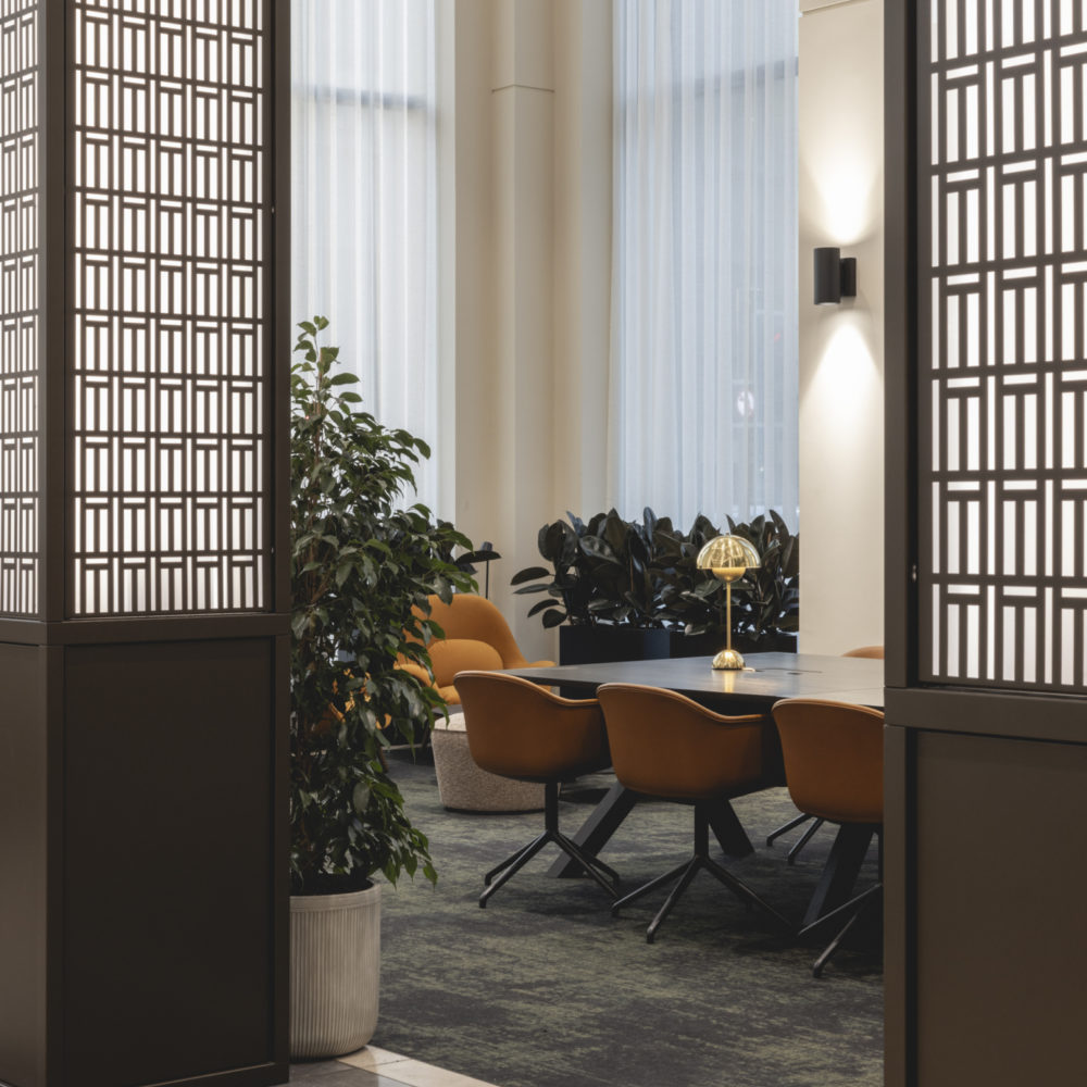 Key to any sustainability strategy is longevity: the longer a piece of furniture lasts, the lower its impact. With this in mind, we collaborated with high-end Nordic design brands such as &Tradition, Muuto, Fredericia, and Carl Hansen. These companies not only produce furniture whose Scandinavian design speaks to the contemporary aesthetics of 4 Angel Square, but their quality construction and characterful minimalism ensure that their pieces will stand the test of time. To top this off, we specified finishes in timber, velvet and brass – materials that develop a natural patina and only grow more beautiful with age. with the design team to finalise finishes and fabrics.