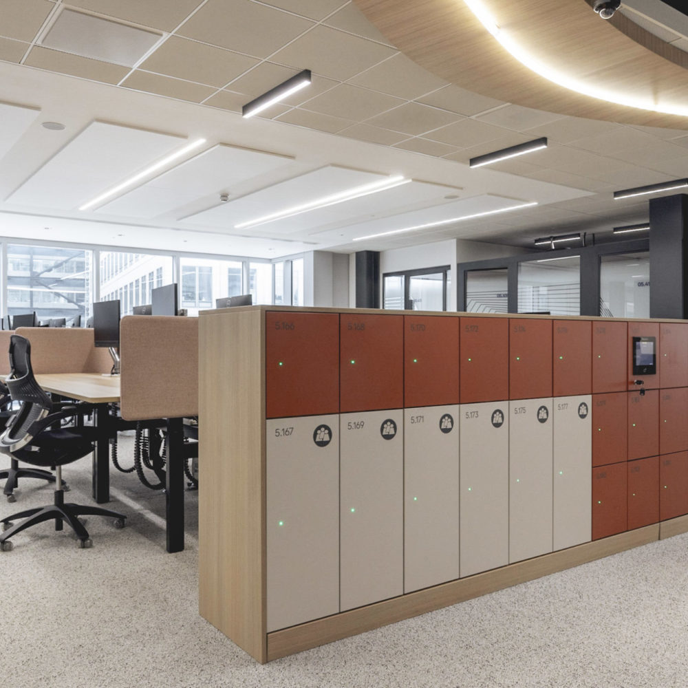Smart technology has been seamlessly integrated throughout the HQ to help smooth employees’ transition to hybrid work and create a workspace that adapts for hyrbid working. We installed smart lockers in the space, which can be booked for individual use or reserved for storing group projects – a means of ensuring a flexible, easy to access home base for all members of the team, no matter their schedules. Meanwhile, all meeting spaces, desks and lockers are bookable, so that users are able to reserve them ahead of time and select a location convenient to them.