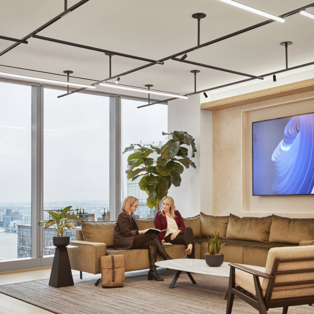 For their flagship project in New York, Darktrace moved to a new office space at One Manhattan West. Designed by Corgan, this new office offered a diverse range of work settings, from informal café and lounge areas to workstations, boardrooms, client-facing meeting rooms and private phone booths. Throughout the selection process, we paid meticulous attention to the specific requirements of each space, particularly considering the confidential nature of Darktrace’s work and the need for a high level of privacy.
