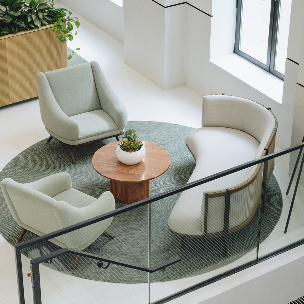 The original architecture of Five St Philips and its place in the heart of Birmingham’s Central Business District, directly opposite the city’s cathedral, demanded respect and sensitivity in its refurbishment. 5plus Architects sought to emphasise and accentuate the building’s existing qualities, including the introduction of a spectacular 1,800 sqft double height reception space that made the most of the building’s envelope, and we adopted a similar light touch in specifying pieces for the space. The client wanted a clean, modern feel for the building that would endure over time, and we responded by building out a full spec that introduced high-quality furniture in natural greens, browns and neutral tones. This approach helped to create a welcoming ambience, enlivened by textile pieces such as rugs from Scandinavian brands Bolon and Kvadrat.