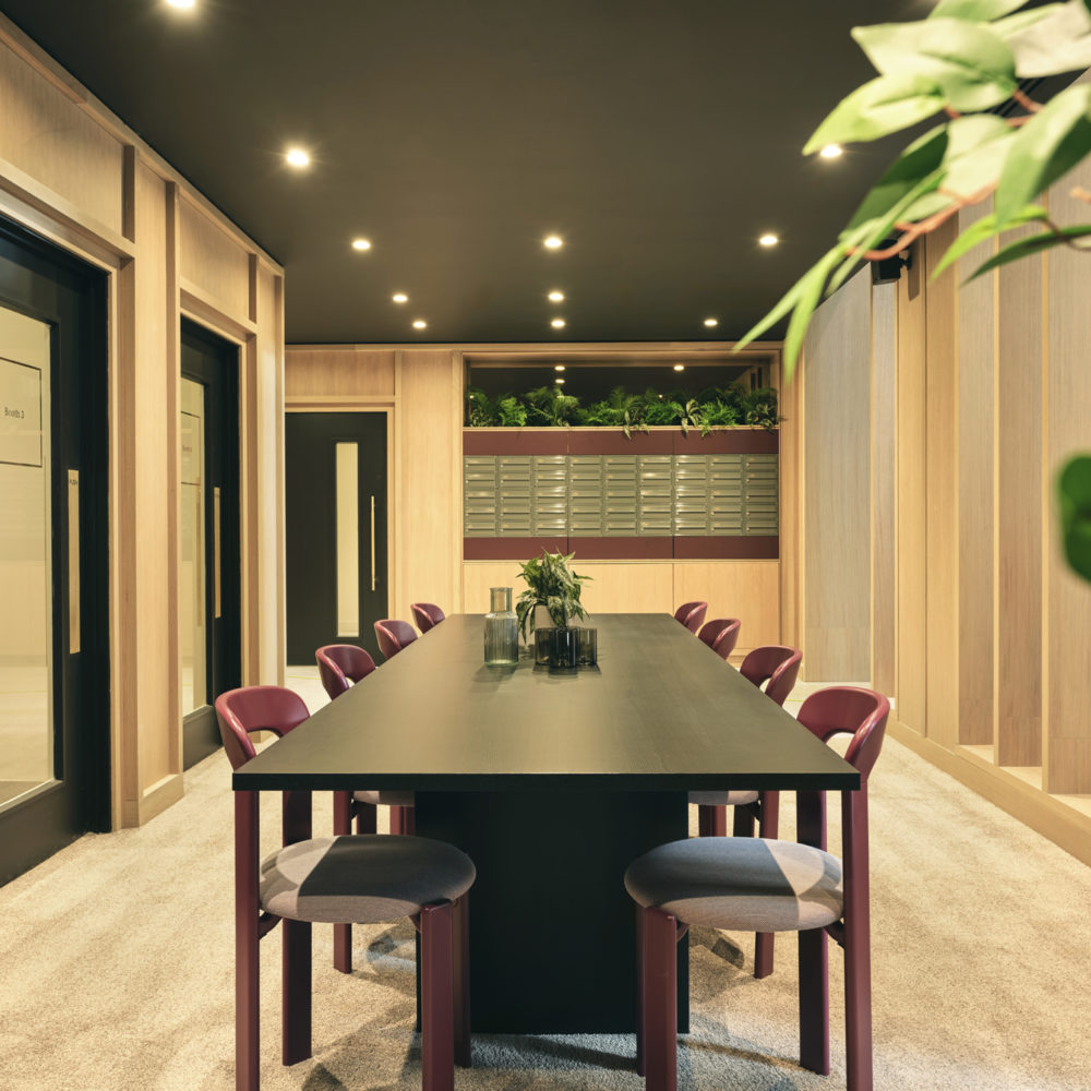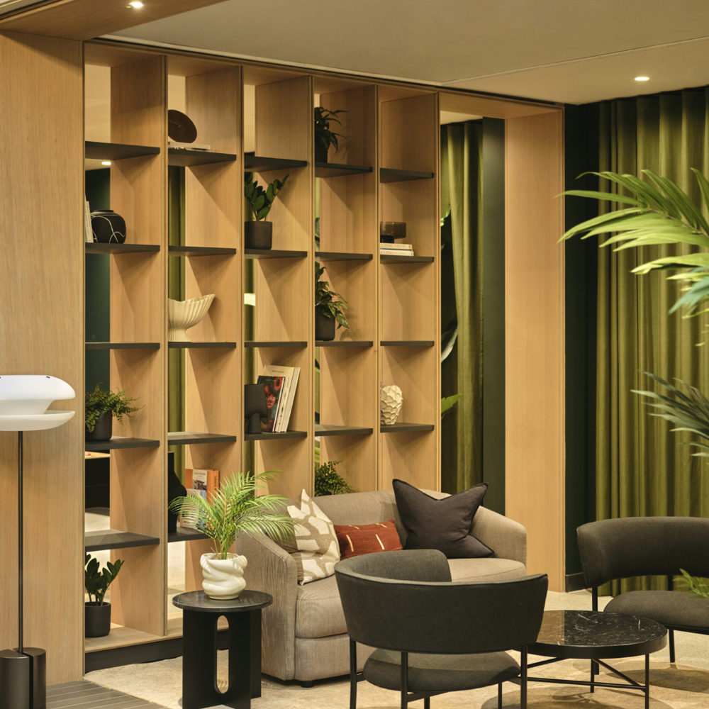 Materiality was a key focus of the furniture brief, alongside a strong emphasis on sourcing location. All furniture was produced within the UK and Europe, with key items, such as apartment sofas, sourced from UK-based manufacturers. Recycled materials were incorporated where possible, including Rely Dining Chairs crafted from post-consumer plastic, and lounge chairs upholstered in Kvadrat’s ReWool fabric.