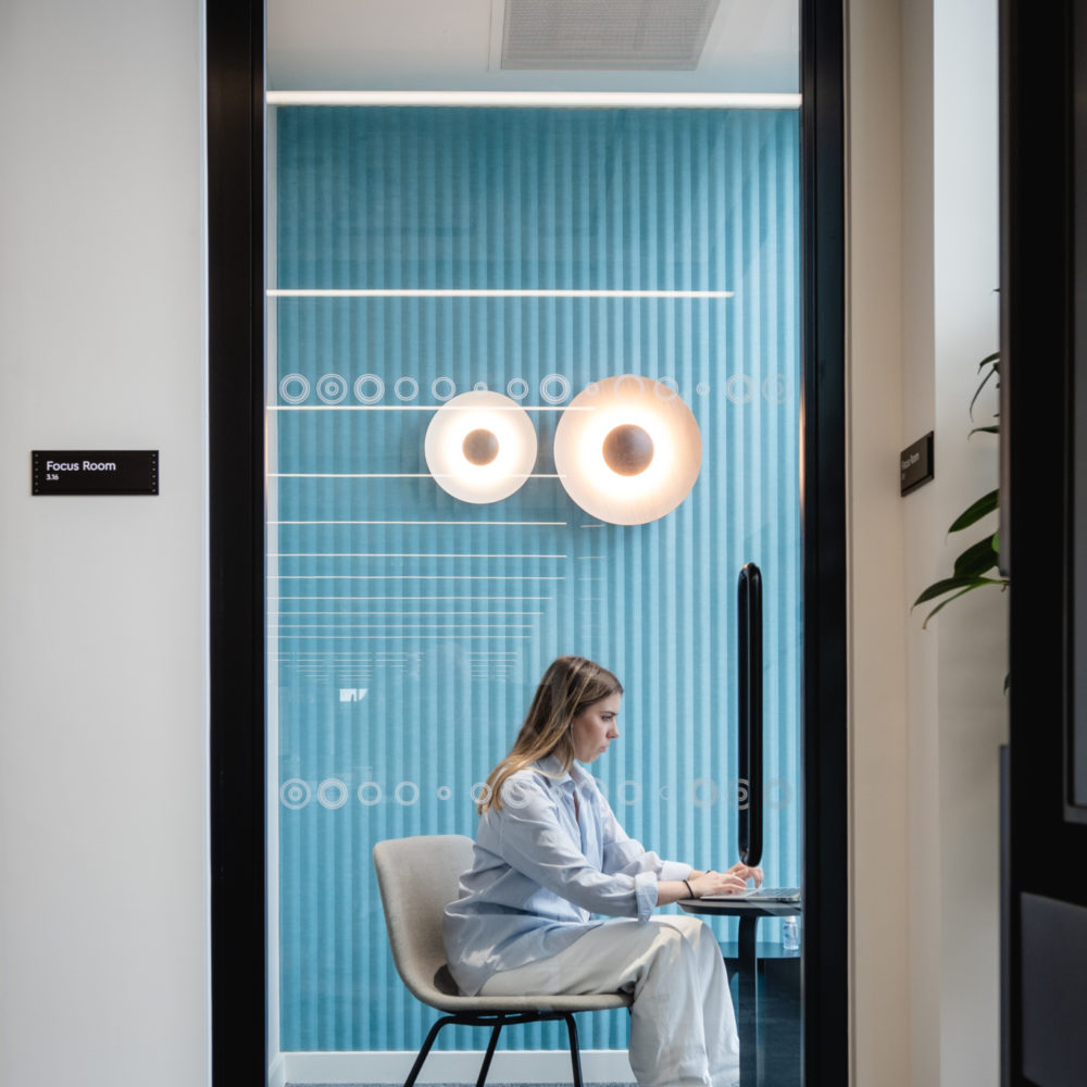 To address the need for privacy for each agency while maintaining flexibility across the working floors, we supported BDG in specifying products that embrace agility and varied work needs, including individual focus work, meeting rooms, phone booths, and creative spaces. This included a system for demarcating spaces using flexible screens and whiteboards—an elegant, adaptable solution that partitions space without building walls, allowing for growth and change. The result is spaces that support each agency’s varied needs without compromising the communal spirit of the campus as a whole.