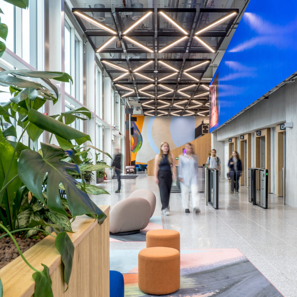 Located on the site of the former Granada Studios in Spinningfields Quarter, the WPP Manchester Campus is an open-plan workspace designed to connect multiple creatives and foster industry-leading work. Inspired by Manchester’s history and resilience, BDG’s design for the building’s layout symbolises a buzzing beehive to encourage collaboration and community. The office features a variety of workspaces, including sit-stand desks, diverse meeting areas, a tranquil roof terrace and social hubs across multiple floors, emphasising flexibility and connectivity. Art and brand agency Acrylicize created digital artwork for the campus, reflecting Manchester’s heritage with elements like cotton looms, iconic album covers, and the Manchester worker bee symbol.